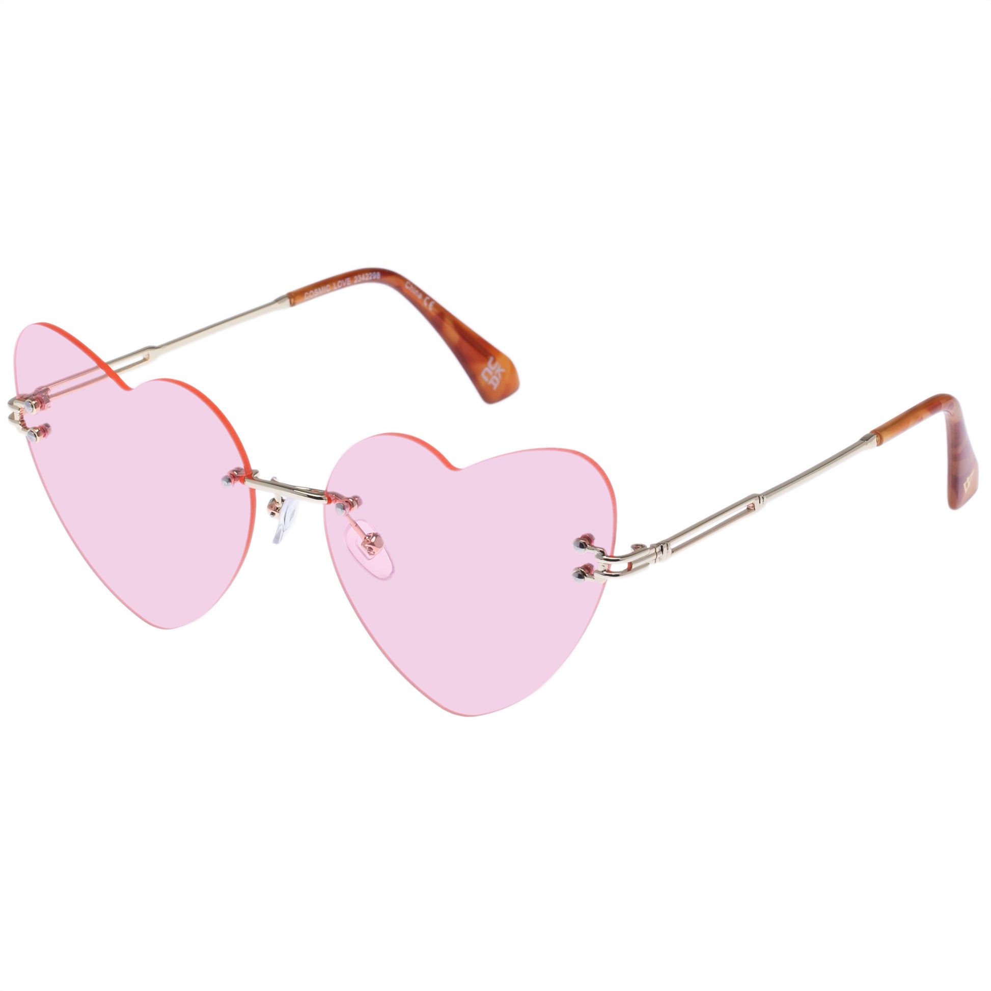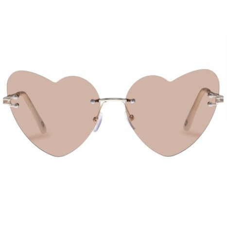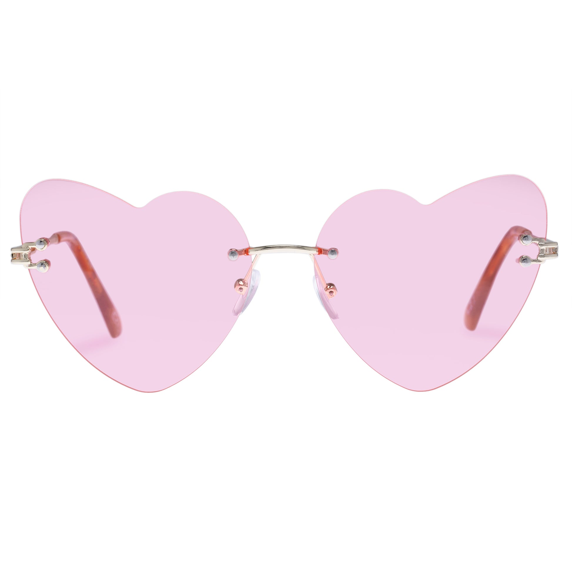 Shades to make your heart skip a beat. Heart shape frame in rimless construction. Medium size fit. Intricate metal temples and adjustable nose pads for comfort.