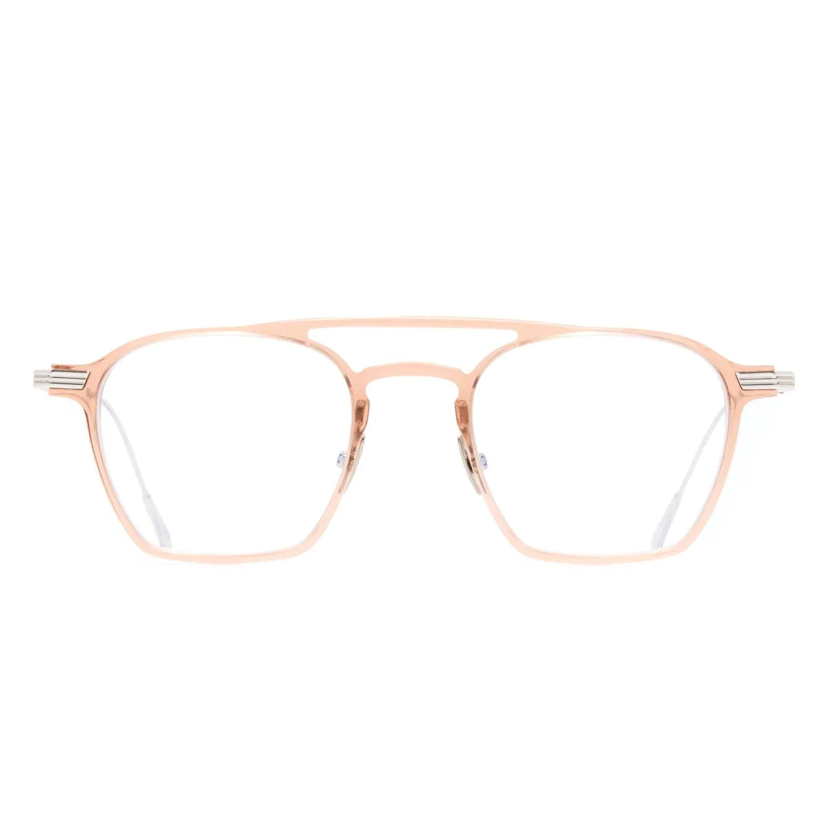 The classic navigator frame takes a new direction, courtesy of the 0009 optical. It is handcrafted from polished acetate and ultra-light metal with a raised double bridge and winged lugs.