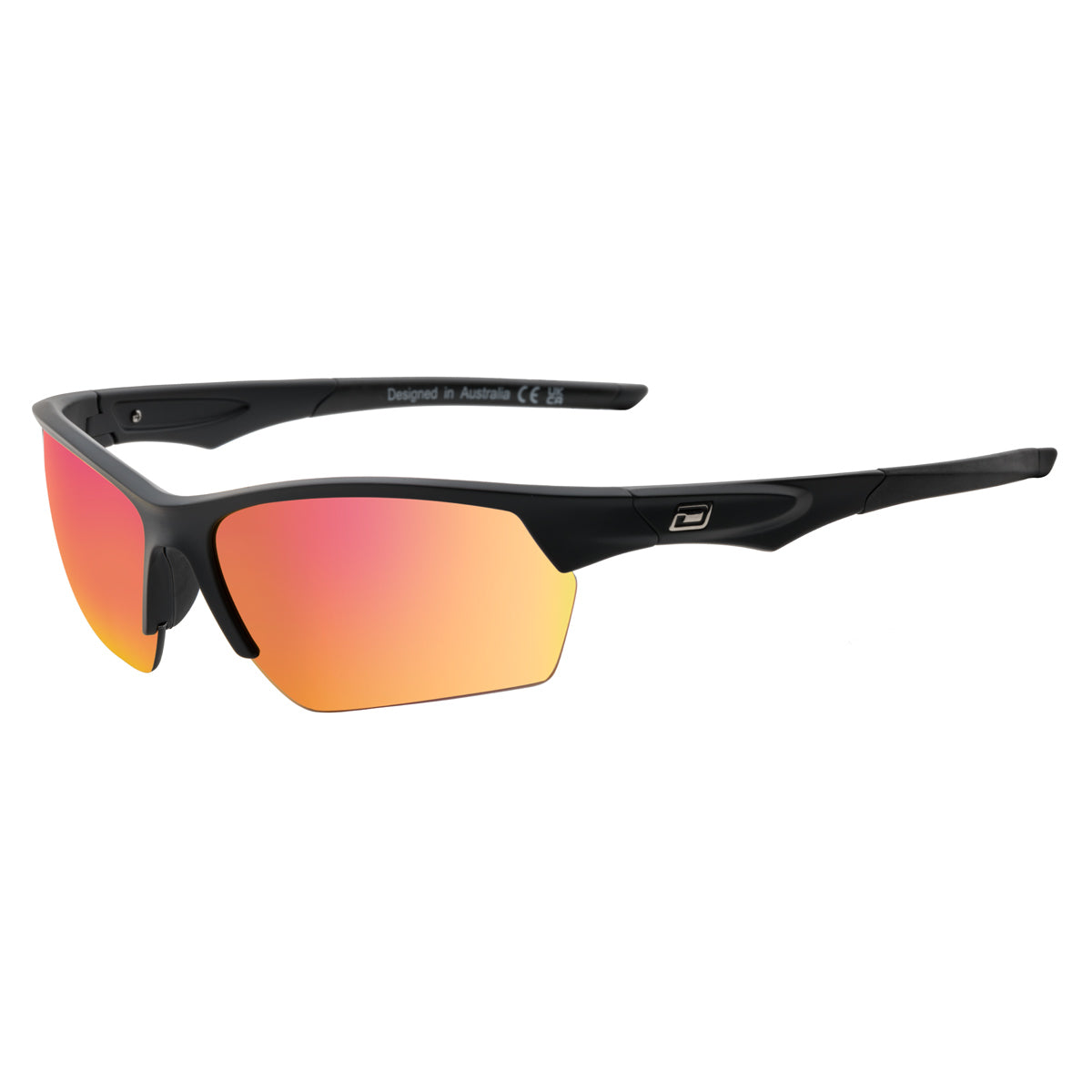 An ergonomically designed light weight sporting frame with rubber nose pads and temple tips for a non-slip sunglass.