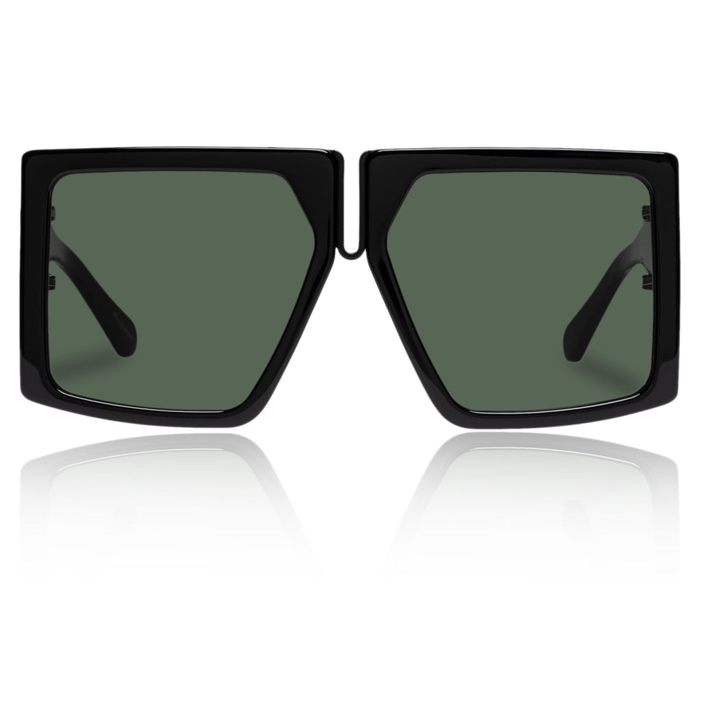 Supersized square frame TWIN TAKE in polished black bio-acetate features custom floating bridge with embossed branding. Deep side shield lamination houses a minimal arrowhead cut-out flowing into sweeping temple shape.