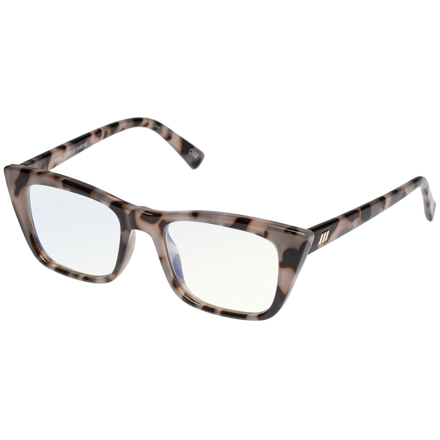 A confident and minimalist aesthetic cat-eye silhouette designed with sharp narrow proportions and adorned with iconic Le Specs flag-stripe gold metal hardware.