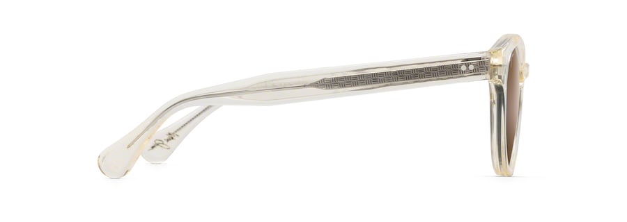 A rounded style with key hole bridge featuring Kapa art-inspired temple designs. The Lauhala (lau-ha-la) Weave design featured in this frame takes inspiration from the Pandanus leaf used for plaiting or weaving in traditional artisinal crafts.