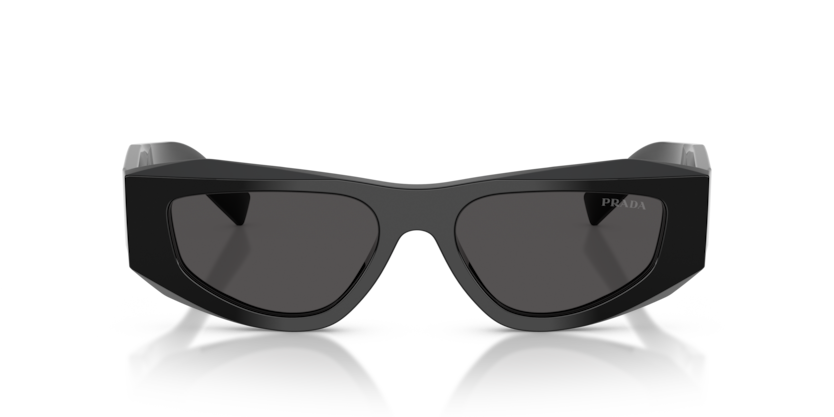 A geometric cat eye silhouette with bevelled detailing and Prada lettered logo on temples.