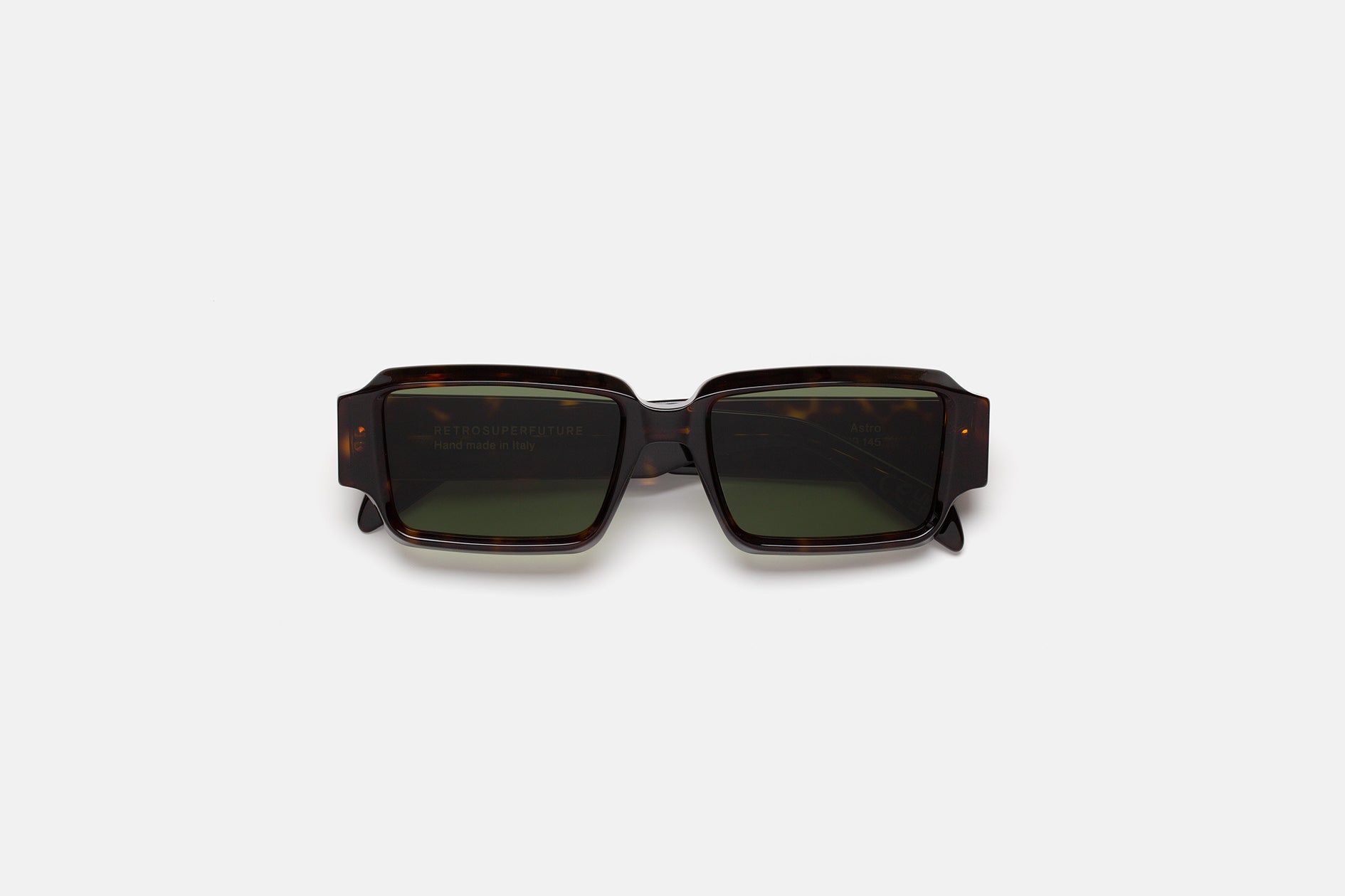 Astro is a squared frame with thick temples and a low nose-bridge, characterised by sculpted rims to form a distinctive slanted, architectural profile. Exceptional Italian acetate in black and matching lenses make this an exquisite high-end design.