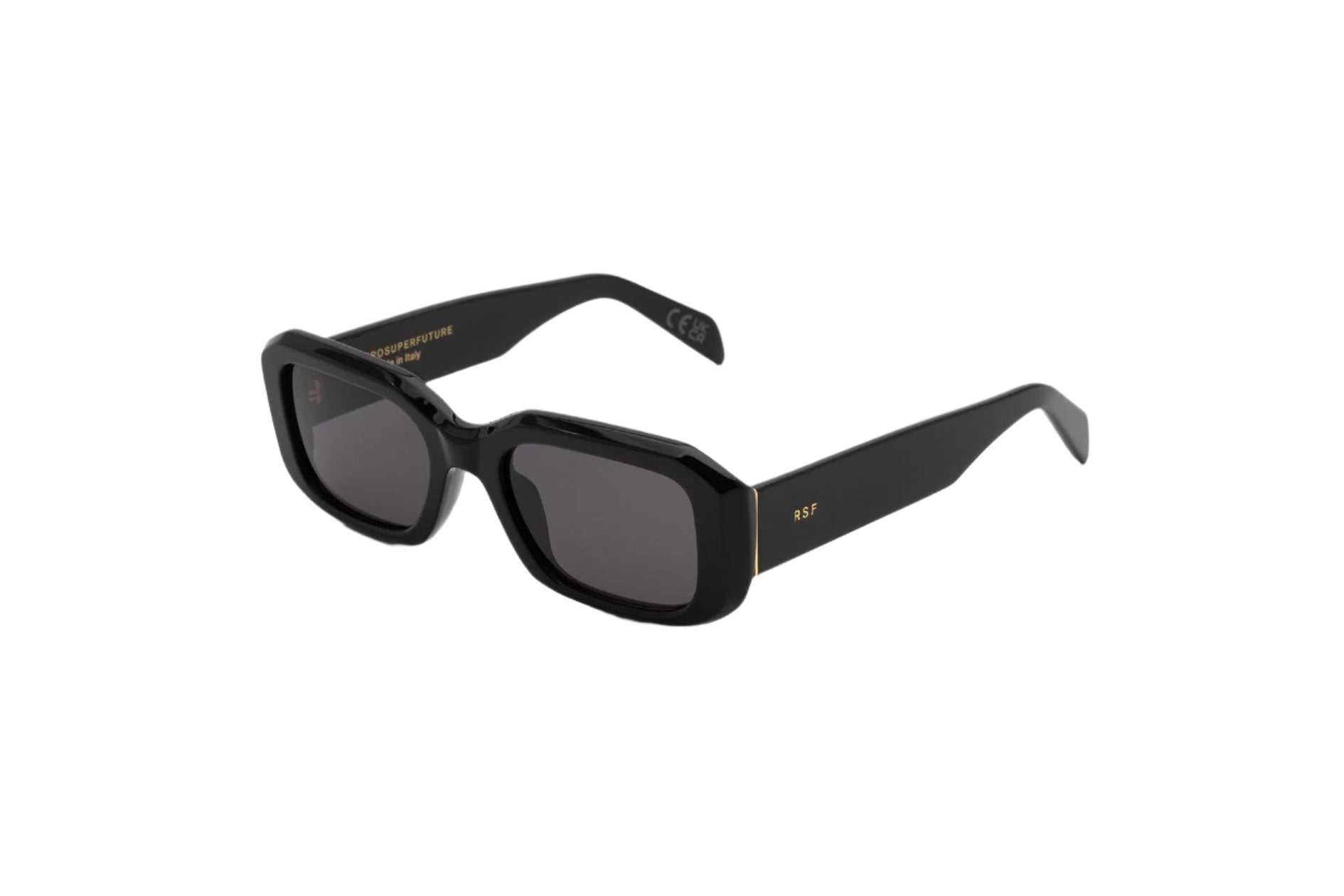 A contemporary, sleek shape with wide semi-flat lenses, chiseled rims and thick temples.