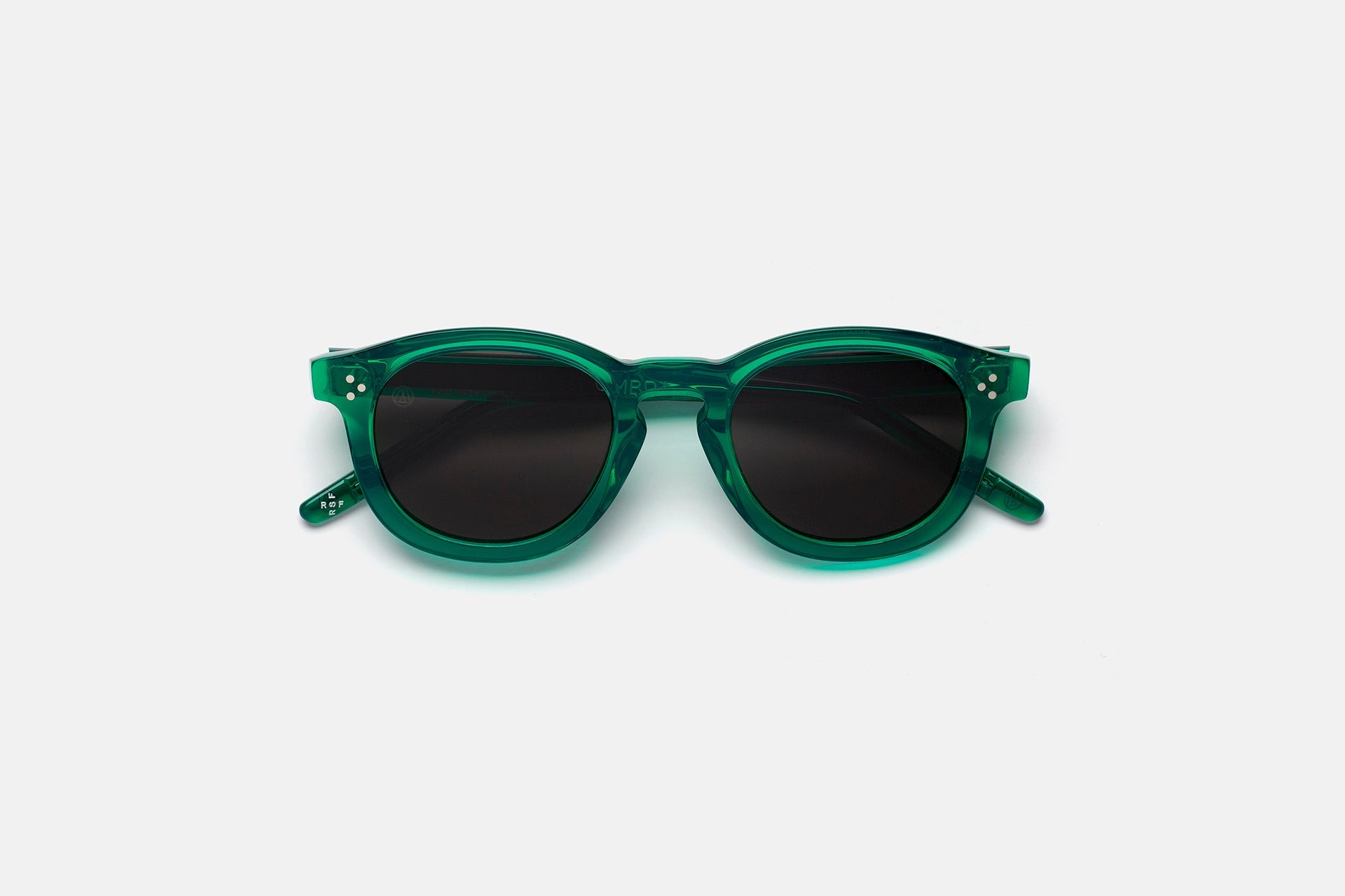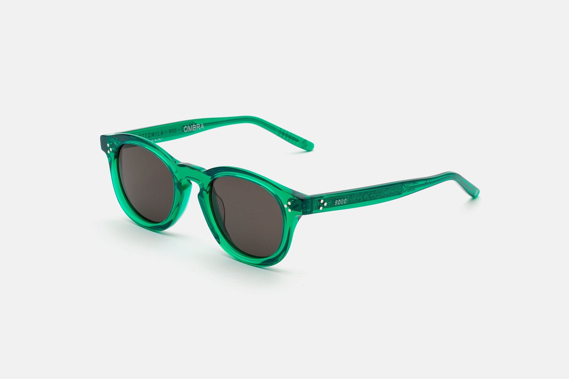 A timeless piece of eyewear designed for Ottomila, a high-end brand known for its meticulous approach to design and craft. Ombra is a contemporary reinterpretation of classic 1950s silhouettes, characterized by a keyhole nose-bridge and rounded lenses. Its curved rims were crafted from thick and sturdy Italian acetate, and carved on the sides to reveal precise, geometric edges. Minute metalwork and inscriptions complete the piece. This version comes with volcanic smoke lenses and a vibrant dark green semitransparent acetate. This translucent effect highlights the personalized metal core with Frank Lloyd Wright pattern decoration in the temples.