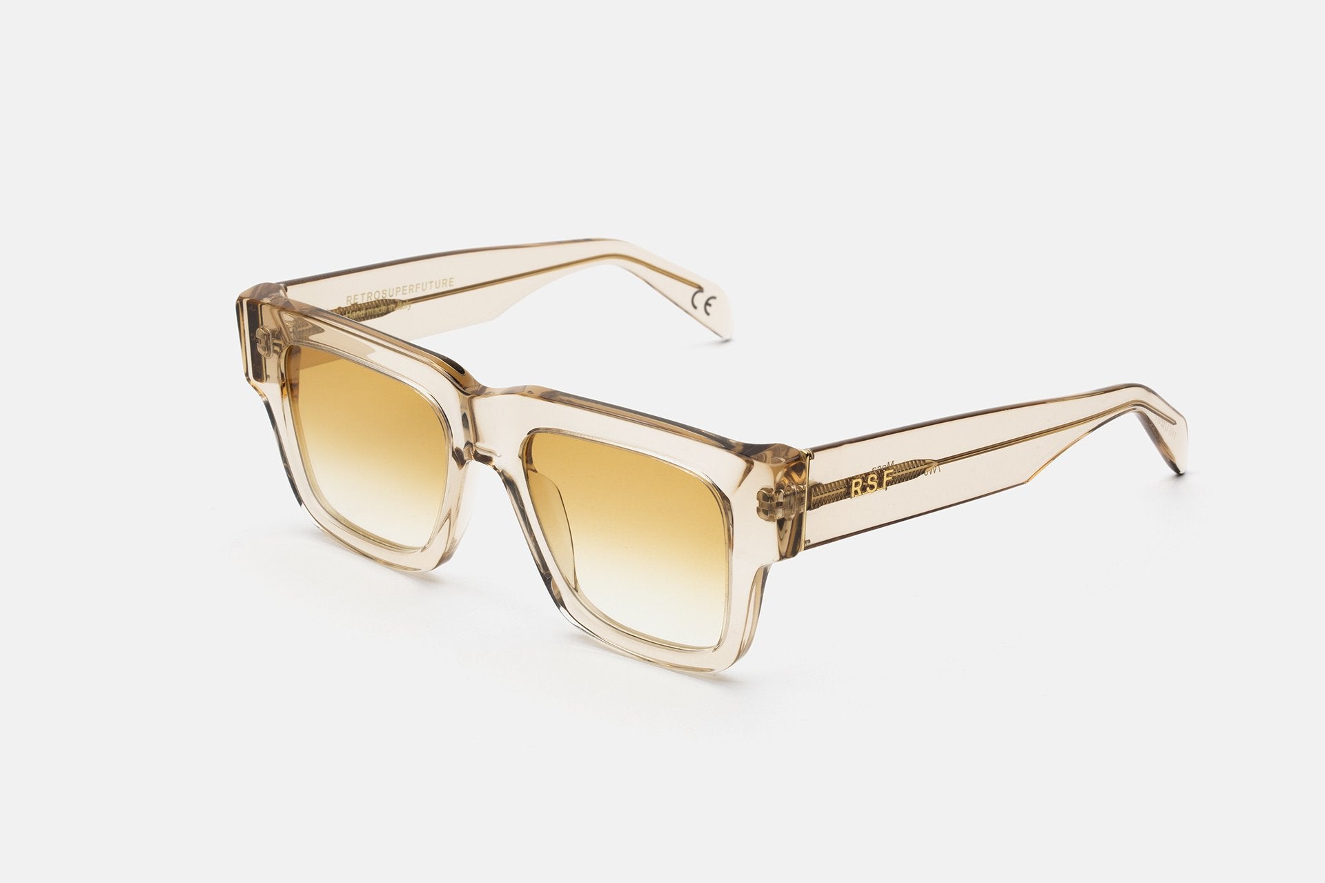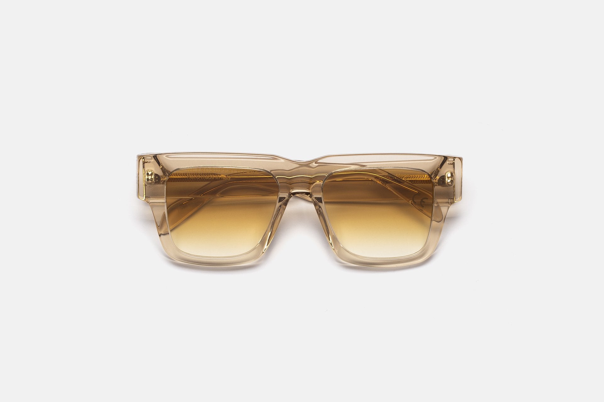 Mega is a statement silhouette conceived as a modern unisex oversized frame. Crafted from high-end Italian acetate for a compact and precise design, the model features tall, thick rims, a sturdy nose-bridge and angular lenses. This version comes in a fine resin crystal acetate and warm yellow faded lenses.