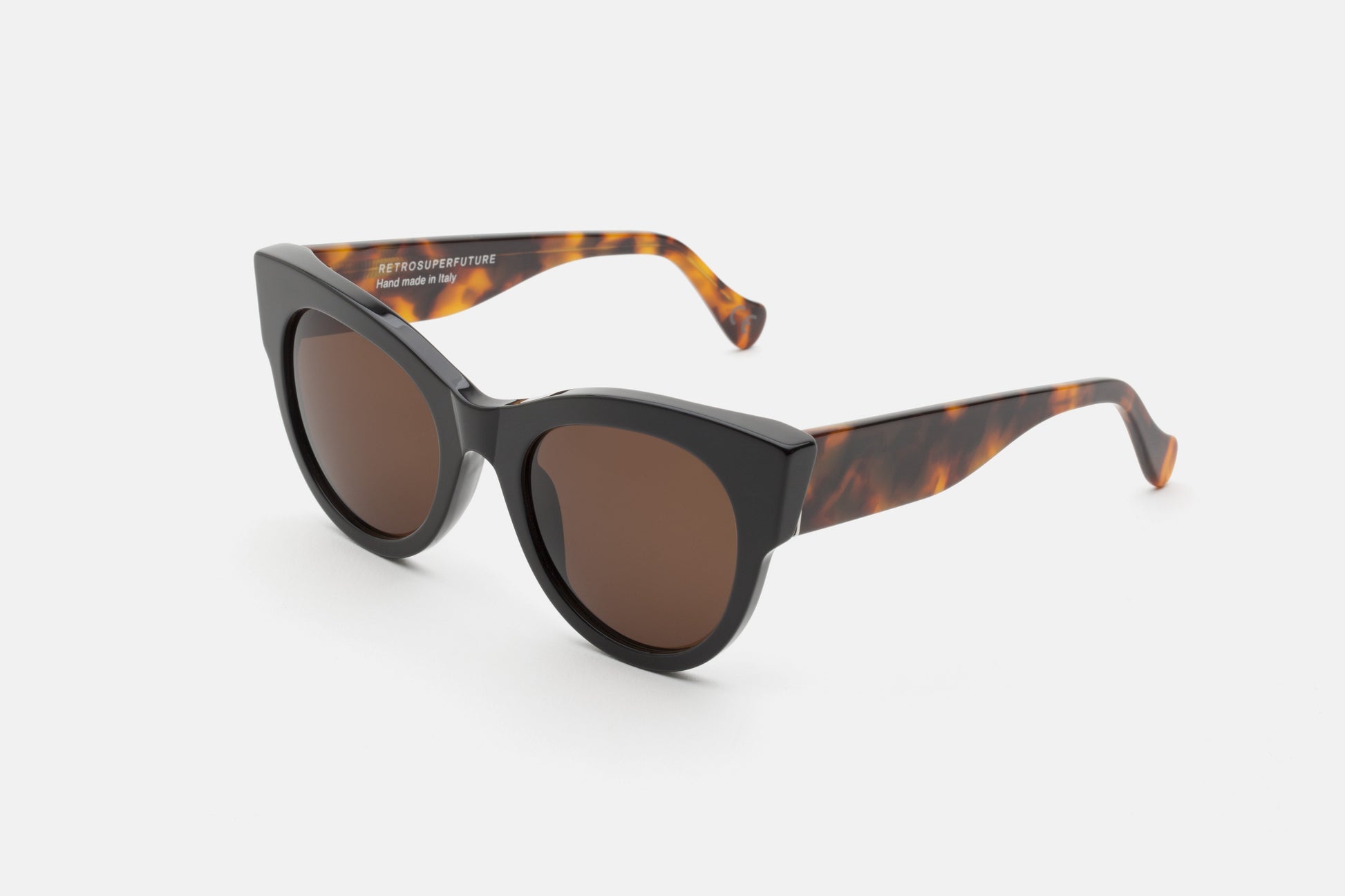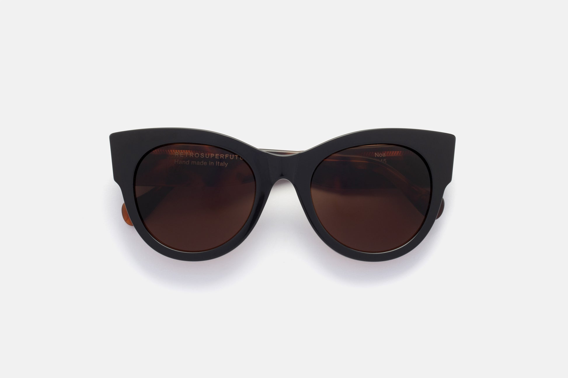 This silhouette is characterised by its thick profile, wide rounded lenses encased within sturdy acetate rims with a curved upper line and pointed temple tips.